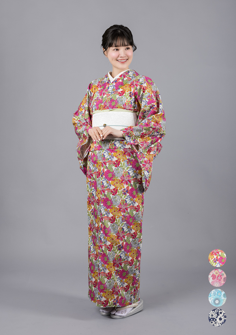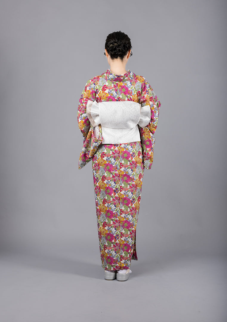 イギリスの老舗百貨店Liberty社が、100年以上生産し続け、世界中に多くのファンを持つ、リバティプリントの生地で着物を仕立てました。